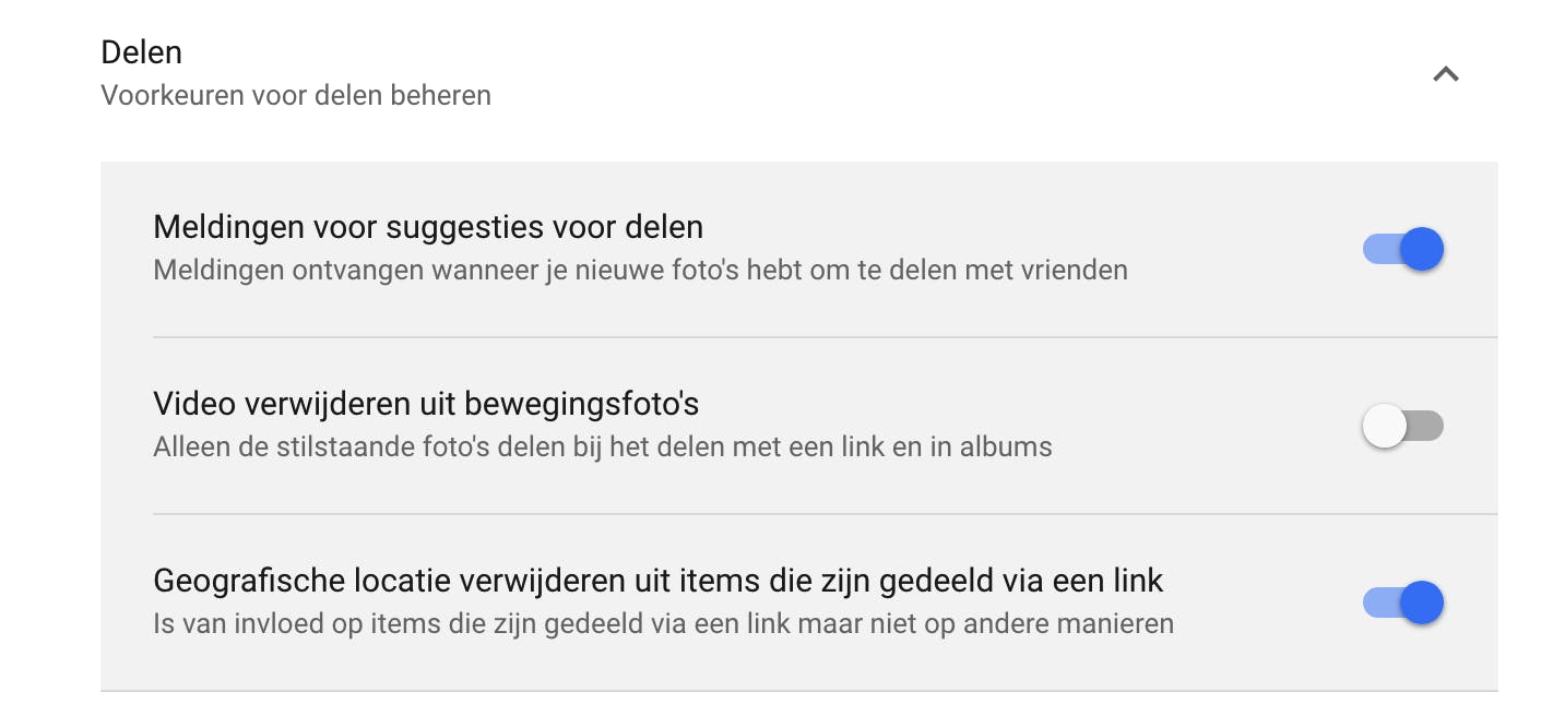 Foto’s die je met de smartphone maakt, bevatten informatie over de locaties waar je de afbeeldingen hebt gemaakt. Handig voor jezelf en voor Google, zodat de afbeeldingen automatisch gegroepeerd worden naar locatie. Maar wil je je foto’s delen via sociale media, dan is het wellicht niet de bedoeling dat iedereen erachter kan komen waar je de opnamen geschoten hebt. Ga via de hamburgerknop naar de Instellingen en klap de groep Delen open om de voorkeuren aan te passen. Daar vink je de optie Geografische locatie verwijderen uit items die zijn verdeeld via een link aan.
