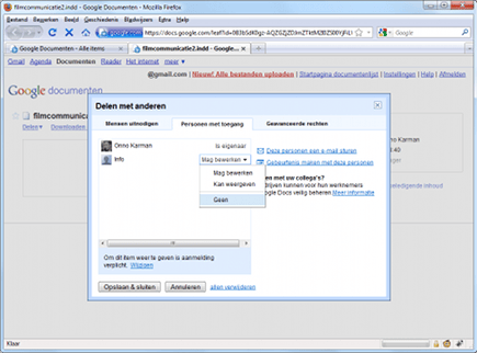 Nadat u de e-mail hebt verstuurd, komt u op het tweede tabblad, waar alle mensen vermeld staan die u zojuist hebt uitgenodigd. Hier kunt u per genodigde ook achteraf nog bepalen wat hun rechten zijn en de rechten desgewenst nog uitbreiden of beperken. Hebt u per ongeluk iemand uitgenodigd die eigenlijk geen toegang zou moeten hebben? Selecteer dan in het menuutje achter de naam de optie Geen.