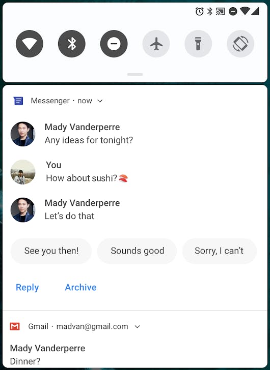 Verbeterde notificaties - Opnieuw gaat het notificatiesysteem van Android op de schop. Voortaan lees je meer informatie af uit je smartphone-meldingen, zoals de eerste regels van een e-mail. Ook is het mogelijk om direct een automatisch antwoord terug te sturen. Of de AI van Google deze verzint - zoals Smart Reply - of dat app-ontwikkelaars ze zelf bepalen, is nog even afwachten.