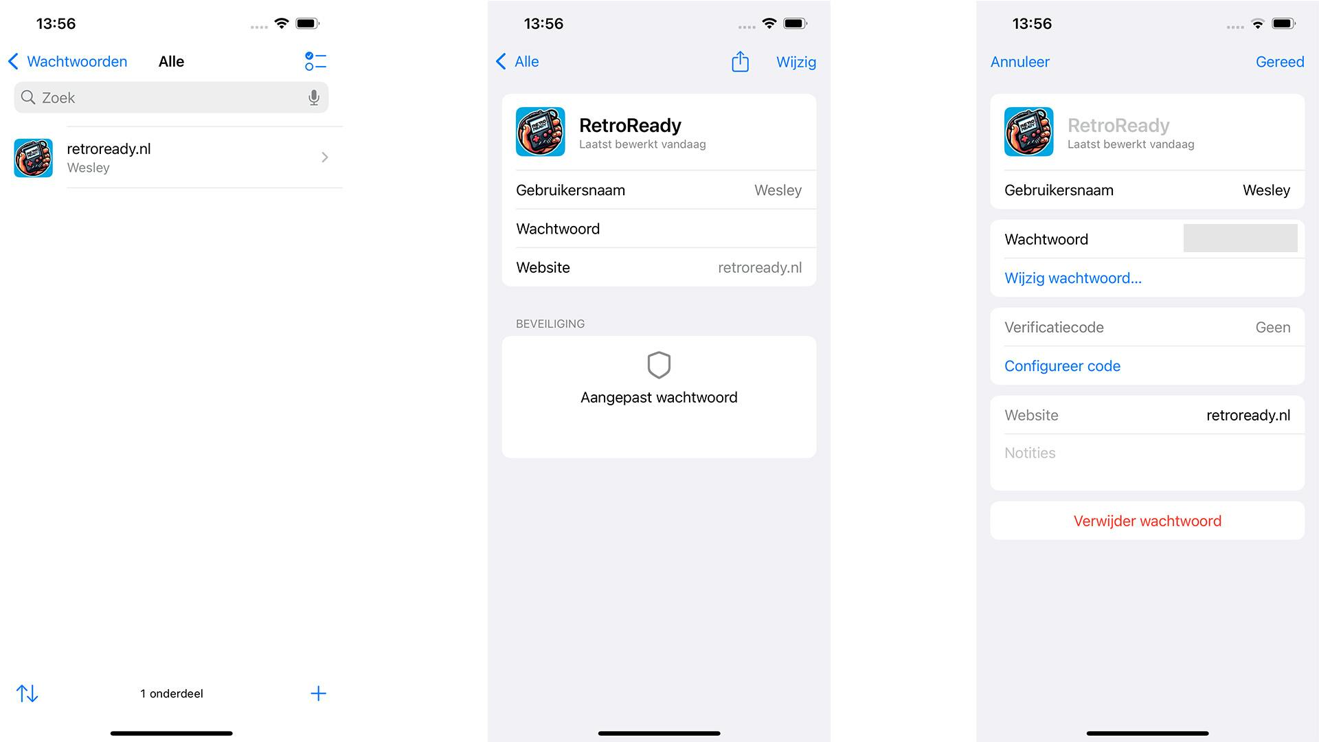 Alle informatie die je binnen deze app opslaat, kun je op elk moment aanpassen. Als je bijvoorbeeld een wachtwoord van een specifieke website, ga je naar Wachtwoorden > Alle > [sitenaam] > Wijzig. Waarschijnlijk hoef je dat niet handmatig te doen, aangezien het besturingssysteem dat je gebruikt zal vragen om bepaalde gegevens te updaten wanneer je ze aanpast. Dat werk neemt de app je dus ook uit handen. Mocht je er toch over twijfelen, kan het geen kwaad om de gegevens eens in de zo veel tijd te controleren.