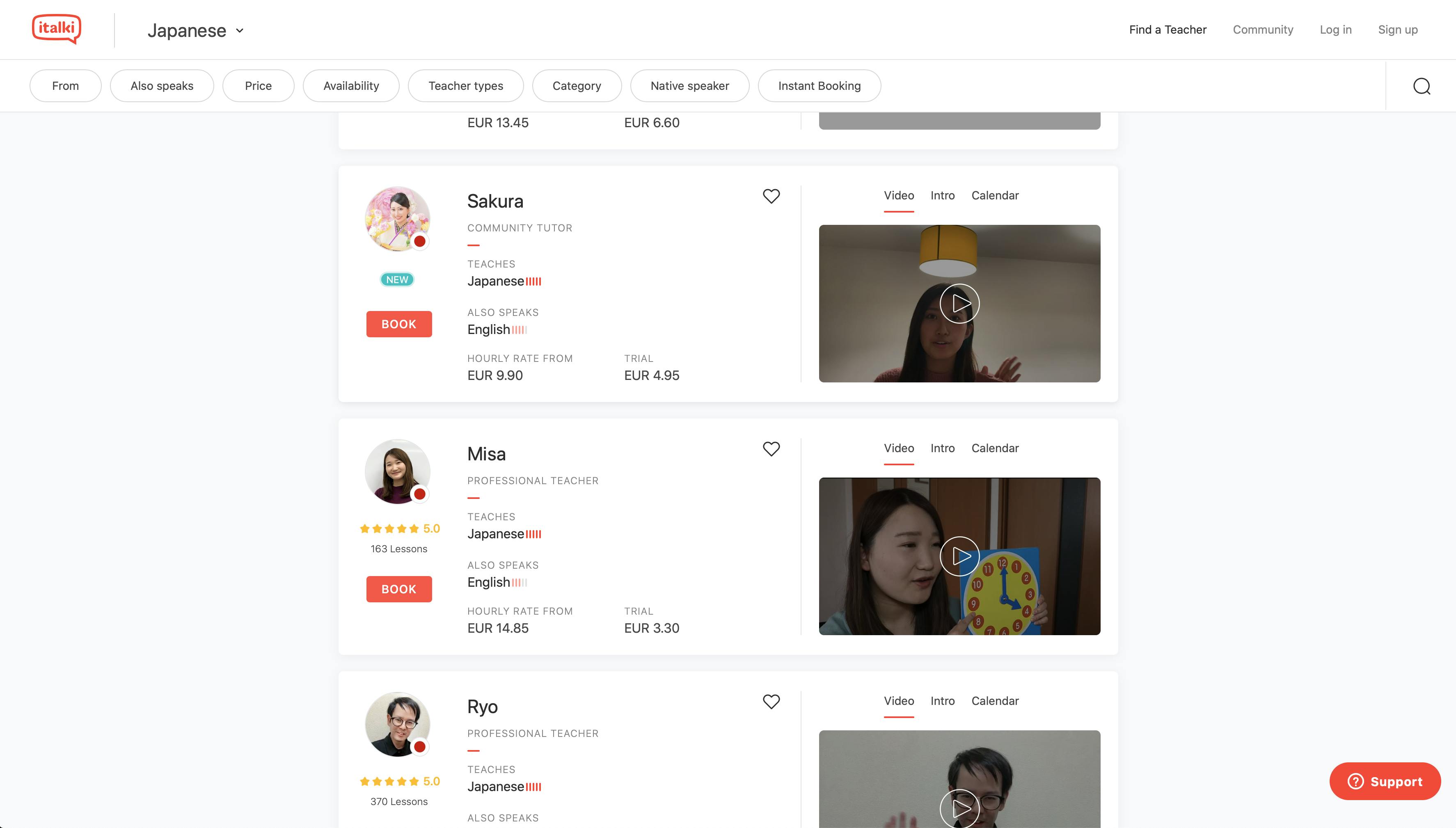 Alle docenten hebben een kleine introductievideo zodat je kennis kunt maken en kunt zien of de docent bij jou zou passen. Bovenin kun je ook nog zoeken op Teacher types, Availability of Native speaker.