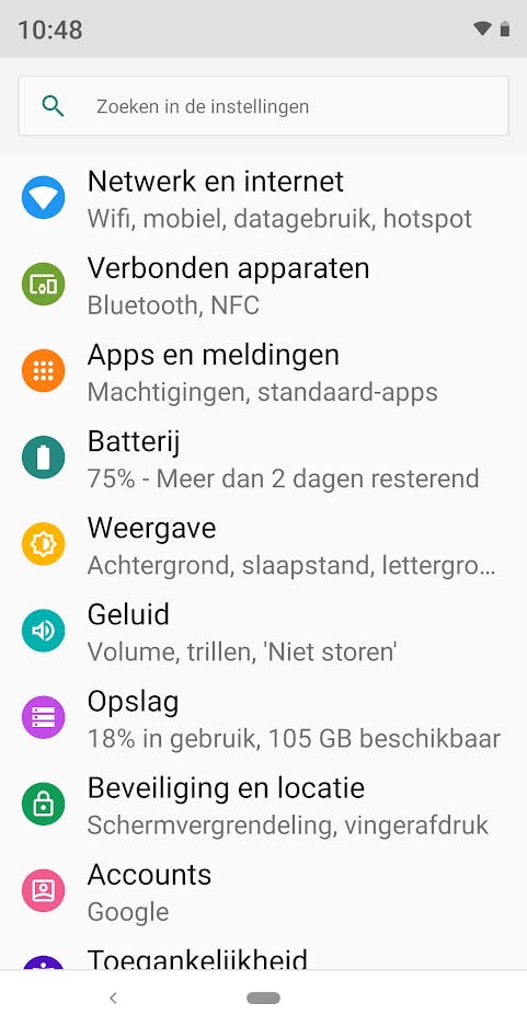 Google geeft Android Pie ook een moderner uiterlijk. De software maakt meer gebruik van de nieuwe Material Design-richtlijnen, met ronde vormen, speelse kleuren en meer witruimte tussen instellingen. Het instellingen-scherm van Pie is bijvoorbeeld kleurrijk vormgegeven en groepeert relevante instellingen onder één categorie. Zo staan onder ‘Netwerk en internet’ alle instellingen die met wifi, mobiel internet en een hotspot te maken hebben. Overigens kunnen fabrikanten als Huawei en HTC zaken als het instellingenscherm naar eigen smaak aanpassen, waardoor het mogelijk is dat de software op jouw Pie-telefoon (iets) anders oogt en werkt.