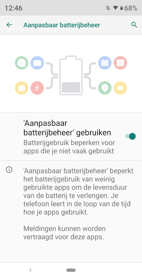 Een verbetering die we ieder jaar van Google horen, is een langere accuduur. Ook dit jaar belooft de Android-maker dat de software energiezuiniger is, voor het eerst door de implantatie van kunstmatige intelligentie. Speciale software zou je telefoongebruik analyseren en weet na een tijdje welke apps je weinig gebruikt. Die apps worden sneller afgesloten zodat ze minder stroom verbruiken – en je accu langer mee moet gaan. Deze Adaptive Battery-functie is ook uit te schakelen in de instellingen.