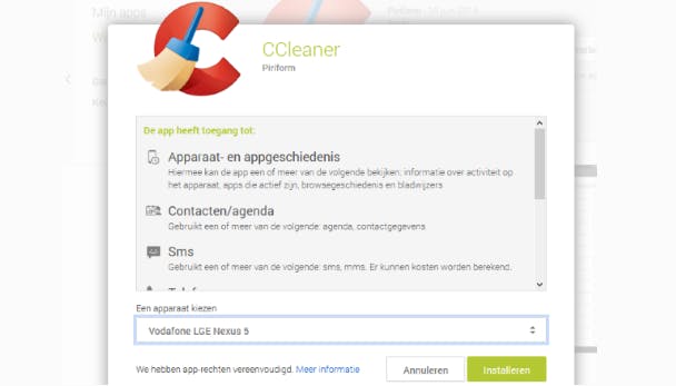 Met de Play Store van Google is het heel eenvoudig om apps vanaf de browser van je pc op je Android-apparaat te installeren. Navigeer naar http://play.google.com en log in via de blauwe knop rechtsboven. Zoek vervolgens een leuke app uit, druk op Installeren, controleer de machtigingen die de app vraagt, selecteer je Android-apparaat waarop je de app wilt installeren en druk nogmaals op Installeren. Je Android downloadt en installeert nu zelf de app.