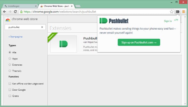 We beginnen met Pushbullet. Deze applicatie is in eerste instantie bedoeld om bestanden tussen je Android-apparaten en je pc te versturen. Maar de app heeft ook nog een andere handige functie: het toont je meldingen op je pc. Wanneer je bijvoorbeeld een e-mail of WhatsApp-bericht ontvangt, zie je dat meteen omdat er een meldingsvenstertje rechtsonder uit het systeemvak omhoog schuift. Hiervoor heb je een Chrome-browserextensie nodig op je pc en een applicatie op je Android-toestel. De Chrome-extensie vind je hier en de app kun je vinden op deze website.