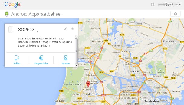 Log hier in met het Google-account dat je ook op je Android gebruikt. Vervolgens krijg je een Google Maps-interface waarin de locatie van je apparaat exact wordt aangegeven. Ben je het toestel kwijt, druk dan op Bellen, hiermee maakt je Android gedurende vijf minuten herrie totdat je het apparaat ontgrendelt. Deze functie werkt overigens ook gewoon voor Android-tablets. Zie je al op de kaart dat je het toestel totaal ergens anders is, dan kun je het beste op Vergendelen drukken, hiermee vergrendel je het apparaat met een wachtwoord dat je zelf ingeeft.