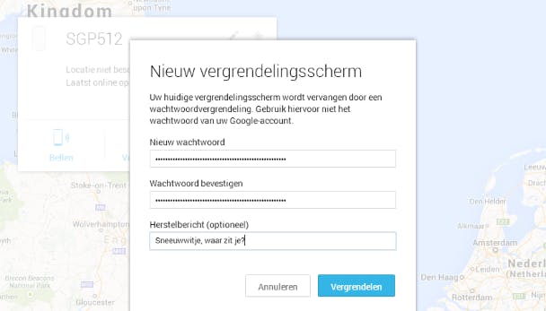 Geef er een herstelbericht bij, zodat iemand die het apparaat aan zet, ziet van wie het Android-toestel is. Als uiterst redmiddel is er nog de knop Wissen, waarmee je al je gegevens op je toestel wist. Gebruik dit natuurlijk alleen maar als je echt geen uitweg ziet om je Android terug te krijgen, want niet alleen ben je je gegevens kwijt, maar omdat het toestel naar fabrieksinstellingen wordt hersteld is hij ook niet meer terug te vinden via het apparaatbeheer.