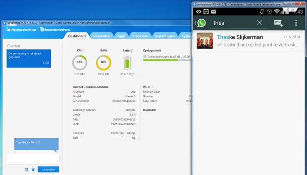 Met bovenstaande trucs heb je veel functionaliteit van je Android overgenomen met je pc. Echter kan je nog niet álles van je Android-apparaat overnemen op je pc. Zie je bijvoorbeeld dat je een WhatsApp-berichtje hebt, dan moet je alsnog je telefoon erbij pakken om te kunnen reageren. Hetzelfde geldt voor andere applicaties op je Android zoals Snapchat en KiK. Er is één manier om dit alsnog te kunnen doen: door je Android-toestel direct over te nemen. Hiervoor gebruiken we de een oude bekende: TeamViewer. Dit programma ken je waarschijnlijk al als tool waarmee je op afstand andermans bureaublad overneemt, maar dit programma kan ook gebruikt worden om op afstand een smartphone of tablet over te nemen.