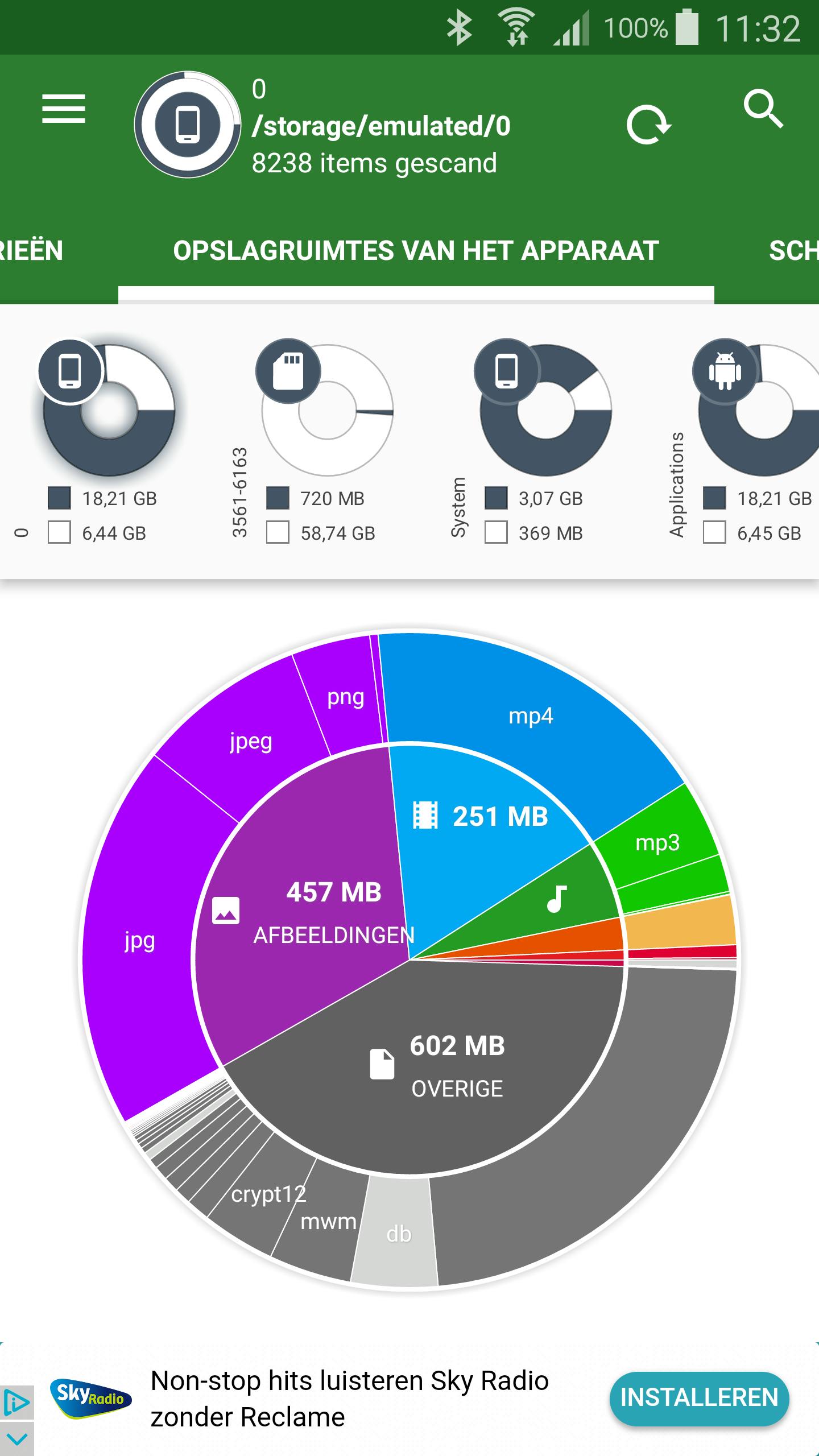 Android geeft via Instellingen / Systeem / Opslag aardig inzicht in het opslaggebruik van je toestel, zowel voor de interne opslag als de geheugenkaart. Een van de apps die dat op een veel mooiere en betere manier inzichtelijk maken, is Discs. Bovenaan kun je een opslaglocatie kiezen, bijvoorbeeld interne opslag, geheugenkaart, de systeempartitie of de partitie waar apps worden opgeslagen. Vervolgens zie je in een grafiek welke soorten bestanden en (onder Schijfgebruik) welke mappen de meeste ruimte innemen. Door de partitie met apps te scannen, krijg je bovendien een mooi gesorteerd overzicht van de ruimtevretende apps. Er zijn apps die meer dan 250 MB ruimte innemen. Dat is vooral zonde wanneer je de app weinig gebruikt en ruimte tekort komt.