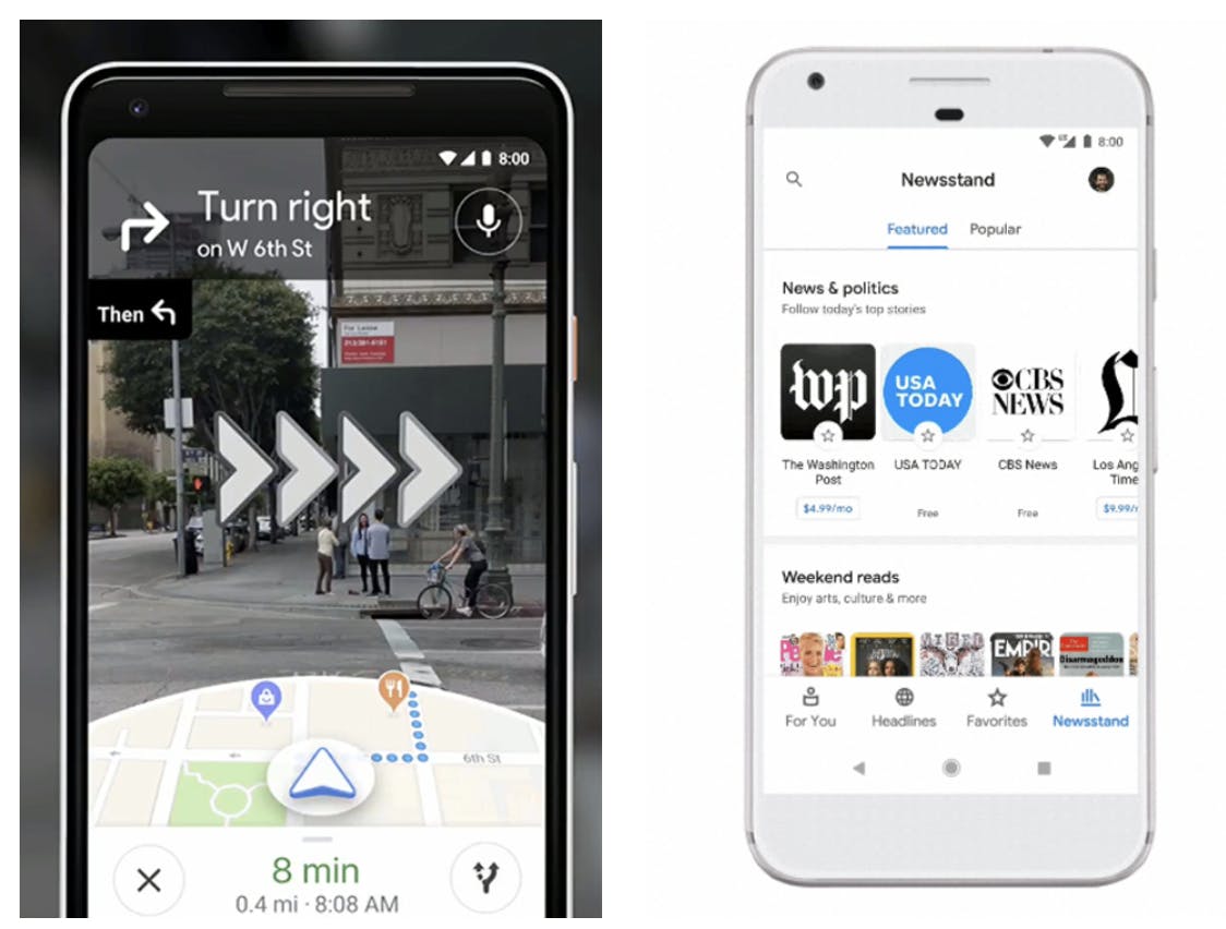 In Maps wordt de AI van Google ingezet voor een nieuwe manier van navigeren. In plaats van een abstracte kaart, zie je door je smartphone-camera gewoon de omgeving om je heen. Routebeschrijvingen worden dankzij augmented reality over het beeld heen geprojecteerd. Integratie met Lens zorgt ervoor dat je direct vanuit Maps extra informatie kunt oproepen over o.a. restaurants. Richt de camera op de ingang, en lees meteen online reviews over de eetgelegenheid in kwestie.