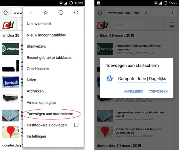 Op deze manier open je een site op dezelfde manier als dat je een app zou openen. Open eerst Chrome en ga naar de website in kwestie. Kies in het menu voor Toevoegen aan startscherm en voer een naam in.