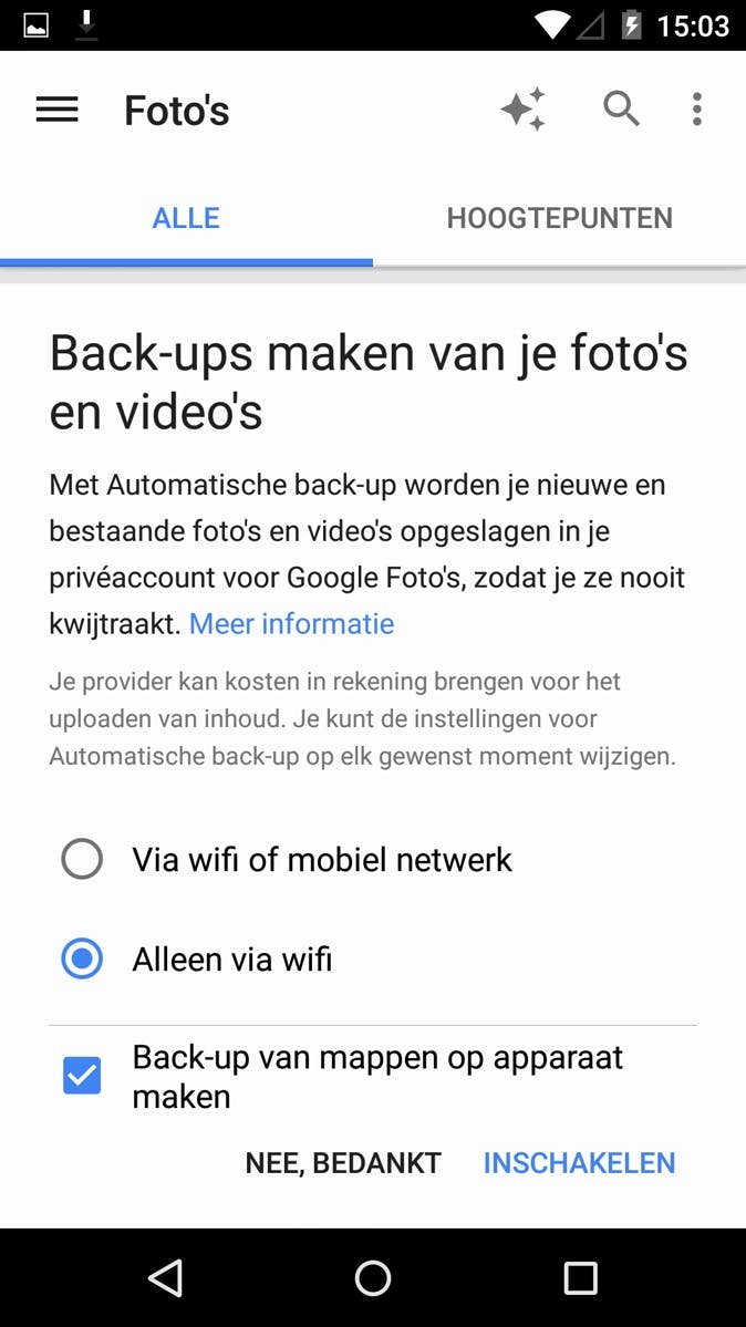 Als je de app voor het eerst opent, moet je je nog even aanmelden door op de Inloggen-knop te klikken. Vervolgens moet je aangeven dat je akkoord gaat met de servicevoorwaarden van Google met de knop Accepteren. Je kunt nu in de app je foto's bekijken. Eén van de interessantste functionaliteiten van Foto's is dat je automatisch back-ups kunt laten maken van je beelden, zodat je die mooie herinneringen nooit meer kwijtraakt. Wil je dat niet, dan kies je bij Back-ups maken van je foto's en video's simpelweg voor Nee, bedankt. Wij raden je echter aan om dit toch in te schakelen. Je kunt zelf instellen of je je afbeeldingen en videofragmenten Alleen via wifi of Via wifi of mobiel netwerk wilt uploaden. De keuze is afhankelijk van de databundel die je gebruikt. Ga verder met Inschakelen.