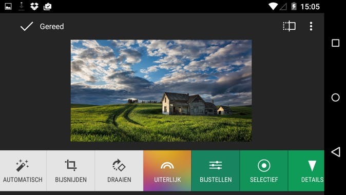 Ten slotte heb je nog enkele presets (voorinstellingen) om je foto een vintage look te geven, wolkenpartijen dramatischer te maken of je afbeelding om te zetten naar zwart-wit of HDR. Je kunt ook nog een tilt-shift-effect gebruiken of je afbeelding van een kadertje voorzien. Om de wijzigingen door te voeren, tik je op het vinkje rechtsboven. Met het knopje links van het vinkje kun je eventueel voor en na met elkaar vergelijken.