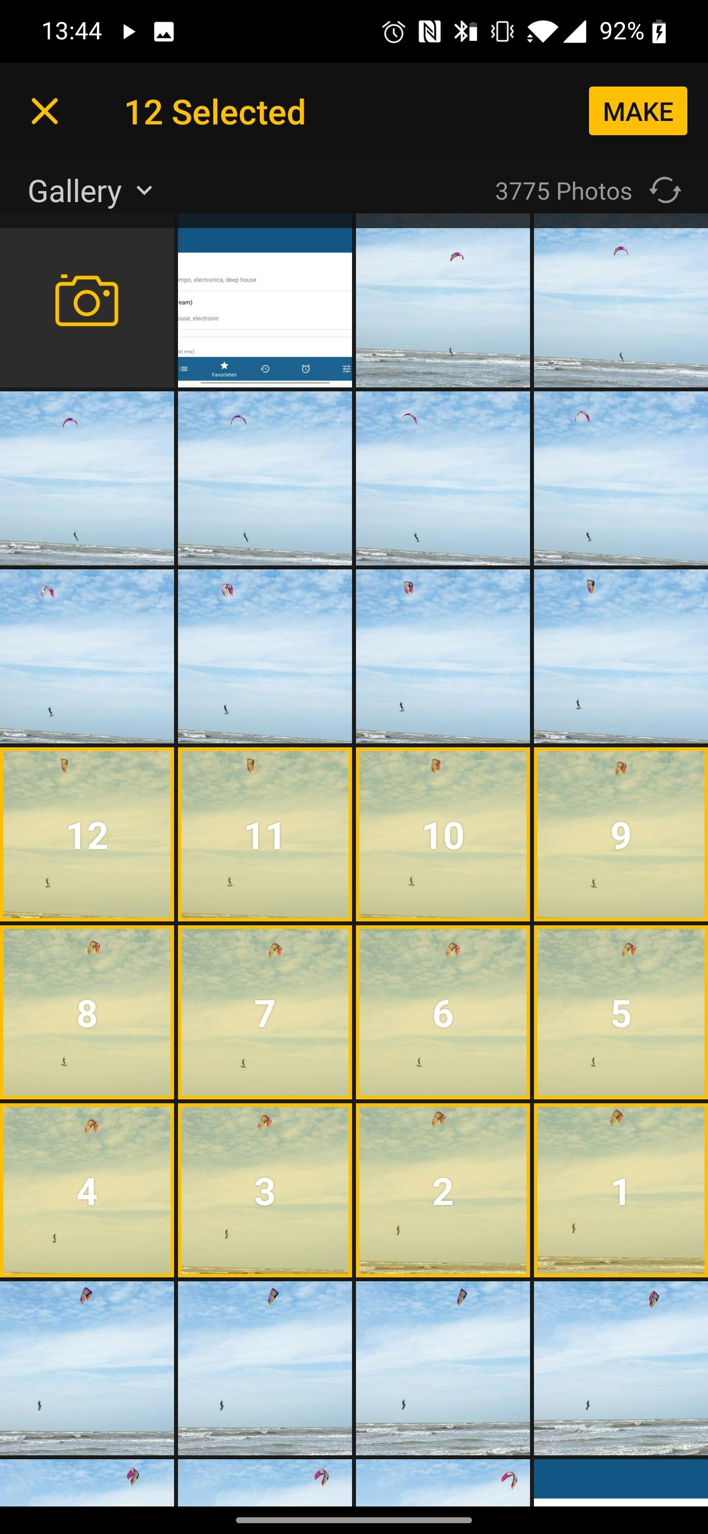 Heb je een Android-telefoon, kies dan bovenin het scherm voor de optie Photos to GIF. Op een iPhone kies je als de continustand is gebruikt de optie Burst en als je losse opnamen hebt gemaakt Photo. Vervolgens tik je in chronologische volgorde op alle foto’s die u wilt gebruiken en tikt op Make.