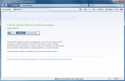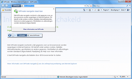 Met de meeste browsers kunt u tegenwoordig anoniem surfen. Dat is nuttig als u bijvoorbeeld een cadeautje voor uw partner zoekt of een weekendje weg aan het regelen bent. In Internet Explorer 8 navigeert u naar Beveiliging / InPrivate-navigatie. Vervolgens opent er een nieuw venster waarin u in de adresbalk aan de indicator ziet dat de privémodus is ingeschakeld. De browser slaat geen cookies, tijdelijke internetbestanden, surfgeschiedenis, formuliergegevens, wachtwoorden en gebruikersnamen op. U kunt ook een nieuw tabblad openen en kiezen voor Browsen met InPrivate.