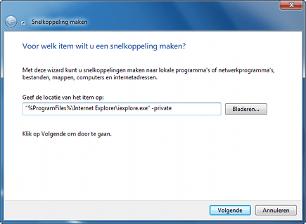 Met een slimme aanpassing surft u voortaan altijd met InPrivate-navigatie. U hoeft deze optie dan niet meer voortdurend handmatig in te schakelen. Klik met de rechtermuisknop op het Bureaublad en kies Nieuw / Snelkoppeling. Geef de volgende locatie op: "%ProgramFiles%\Internet Explorer\iexplore.exe" -private. Klik op Volgende en bedenk een naam voor de snelkoppeling. Sluit ten slotte af met de knop Voltooien. Gebruik voortaan de nieuwe snelkoppeling om anoniem te surfen.