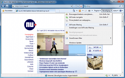 De inhoud van websites wordt vaak weergegeven door meerdere bronnen, zoals advertenties, afbeeldingen en analyseprogramma's. Dit soort content wordt aangeboden door websites van derden en biedt grote voordelen voor deze bedrijven. Deze inhoudsproviders houden namelijk precies het gedrag van de bezoeker op de betreffende website bij. Dankzij de functie InPrivate-filtering in Internet Explorer 8 bepaalt u zelf of indirecte websites toegang krijgen tot deze gegevens. Ga naar Beveiliging / InPrivate-filtering. Voor elke browsersessie dient u de functie opnieuw in te schakelen.
