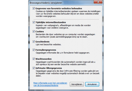 Wis na een surfsessie de geschiedenis in Internet Explorer. Open Extra / Internetopties en klik bij Browsegeschiedenis op Verwijderen. Plaats vervolgens vinkjes voor alle opties die u niet wilt bewaren. Bevestig de opschoonactie met Verwijderen. Handig is de mogelijkheid om de gegevens van uw favorieten niet te wissen, waardoor die sneller worden weergegeven. In dat geval plaatst u een vinkje voor Gegevens van favoriete websites behouden. U geeft in het dialoogvenster Internetopties desgewenst aan hoeveel dagen Internet Explorer de surfgeschiedenis moet bewaren.