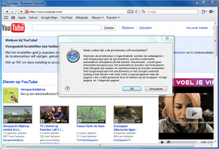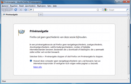 Ook met Firefox surft u volledig anoniem. U activeert deze functie via Extra / Privénavigatie starten. In het scherm dat verschijnt, bevestigt u dat u op deze manier wilt surfen. Firefox bewaart de openstaande tabbladen en opent vervolgens een schoon venster. Cookies, tijdelijke internetbestanden en de geschiedenis worden tijdens het surfen niet opgeslagen. Wel creëert u alsnog bladwijzers (favorieten) en downloadt u bestanden van internet. U ziet aan de venstertitel dat de privémodus is ingeschakeld. Wilt u de functie uitzetten? Navigeer dan naar Extra / Privénavigatie stoppen.
