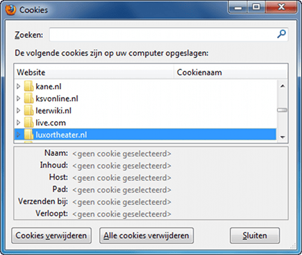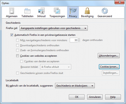 Veel websites plaatsen kleine bestandjes op uw pc waarin diverse gegevens worden opgeslagen. Deze zogeheten cookies zijn waardevol voor adverteerders. Firefox biedt een optie om ze eenvoudig te blokkeren. U kunt ook cookies van specifieke websites verwijderen. Dat is bijvoorbeeld handig als u wilt voorkomen dat een gezinslid ziet dat u een bepaalde website hebt bezocht. Open Opties en kies Privacy. Selecteer Aangepaste instellingen gebruiken voor geschiedenis. Klik op Cookies tonen en selecteer het bestand van een site dat u wilt wissen. Bevestig met Cookies verwijderen.