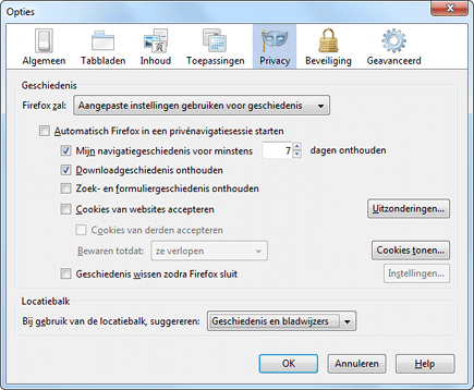 Wellicht wilt u zelf bepalen welke informatie Firefox bewaart en welke sporen u liever niet achterlaat. Navigeer naar Extra / Opties en open het paneel Privacy. Selecteer bij Firefox zal: de optie Aangepaste instellingen gebruiken voor geschiedenis. Zorg dat er geen vinkje staat voor Automatisch Firefox in een privénavigatiesessie starten. U beslist nu zelf welke gegevens u wilt bewaren door de vinkjes in de selectievakjes voor de juiste onderdelen te plaatsen. Zo kiest u er bijvoorbeeld voor om de downloadgeschiedenis te onthouden en cookies van websites te accepteren.