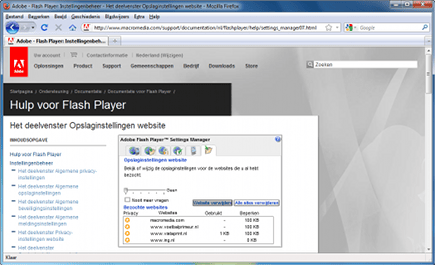 Wanneer u Firefox niet gebruikt, verwijdert u ook via een andere methode flash-cookies. Zelfs als u in de privémodus surft, worden deze hardnekkige bestanden op uw harde schijf bewaard. Hierdoor zien personen die dezelfde pc gebruiken evengoed welke websites u hebt bezocht. Als u geen sporen achter wilt laten, neemt u gemakkelijk maatregelen. Surf naar flashcookie, waarna er een overzicht van bestanden verschijnt die op uw computer staan. Kies voor de optie Alle sites verwijderen.