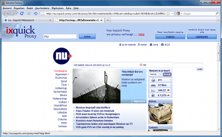 Met Ixquick zoekt u op internet, zonder dat bezoekersinformatie wordt bewaard in de database van deze metazoekmachine. De website bevat ook een geïntegreerde proxydienst. Op die manier blijft niet alleen uw zoekgedrag anoniem, maar bent u tevens beschermd als u op een link klikt van een zoekresultaat. Surf naar ixquick en voer een willekeurig trefwoord in. Klik bij een resultaat op Proxy om de website anoniem te bekijken. Vervolgens haalt Ixquick met enige vertraging binnen een eigen frame de volledige website op.