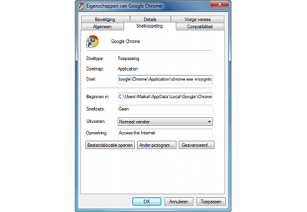 Helaas bevat Chrome geen optie om standaard anoniem te surfen, waardoor u de functie iedere keer handmatig moet activeren. Met een trucje wijzigt u dat eenvoudig, zodat u voortaan altijd de privémodus gebruikt. Klik met de rechtermuisknop op Google Chrome in menu Start en kies Eigenschappen. Bij Doel voegt u -incognito aan het bestaande pad toe. Zorg er wel voor dat u eerst op Spatie drukt, voordat u de opdracht invoegt. Bevestig de wijziging met Toepassen en OK. Er worden vanaf nu geen gegevens meer bewaard op uw computer.