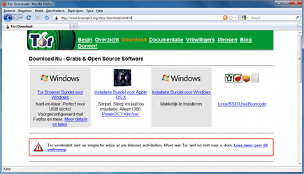 Hoewel u in nagenoeg alle browsers de mogelijkheid hebt om geen gegevens te bewaren, maakt het u niet anoniem. Met het Tor-netwerk bent u dat wel. Hiermee maakt u niet direct verbinding met een server van een bepaalde site, maar verloopt het dataverkeer langs een willekeurige route via een aantal andere Tor-gebruikers. De afkomst van de berichten blijft onbekend, omdat iedere schakel herkomstinformatie uit de bestanden wist. Bovendien wordt er versleuteling toegepast. Download een installatiebundel voor Windows, Mac OS of Linux via Torproject.