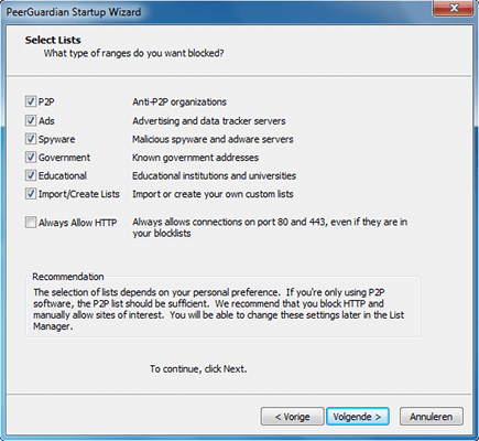 Het is een publiek geheim dat overheidsinstellingen en opsporingsinstanties burgers controleren bij verschillende online activiteiten, zoals uw download- en uploadverkeer. PeerGuardian 2 blokkeert inkomende ip-adressen van dergelijke organisaties. Verder houdt de tool spyware en advertenties tegen. Surf naar Phoenixlabs en download het programma. Na de installatie geeft u in de openingswizard aan van welke soorten instanties het de ip-adressen moet blokkeren. Verder bepaalt u hoe vaak het programma de zwarte lijst moet bijwerken.