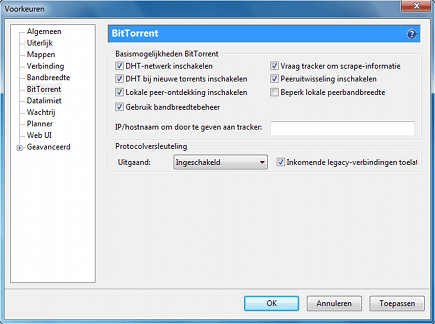 Ook bittorrentverkeer versleutelt u eenvoudig, zodat u luistervinken buiten de deur houdt. Dat is bijvoorbeeld mogelijk met de populaire cliënt µTorrent. Navigeer naar Opties / Voorkeuren / Bittorrent. Zet bij het onderdeel Protocolversleuteling de optie op Ingeschakeld. Zodra de connectie hapert, valt µTorrent terug op een onversleutelde verbinding. Wilt u dat liever niet? Selecteer dan de optie Geforceerd. Sluit af met Toepassen en OK. Ook bij de meeste andere bittorrentcliënts, zoals Vuze, is encryptie mogelijk.