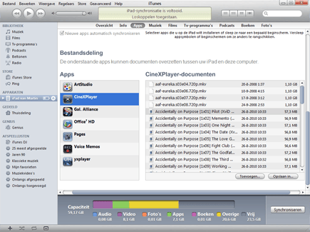 Voor dit voorbeeld gebruiken we de app CineXPlayer, voor het uploaden van DivX-video’s. Start iTunes en wacht tot de iPad, iPhone of iPod Touch is gedetecteerd. Klik vervolgens op het tabblad Apps en scroll naar beneden. Bij bestandsindeling ziet u de apps staan die bestandsoverdracht ondersteunen (in ons geval dus CineXPlayer). Klik op de gewenste app en in het rechterdeelvenster op de knop Toevoegen. Blader naar het gewenste bestand en klik op Openen (u kunt de Shift-toets ingedrukt houden om meer bestanden te selecteren). Het bestand wordt nu overgezet naar het apparaat (rechtstreeks, zonder dat er conversie of iets dergelijks nodig is).