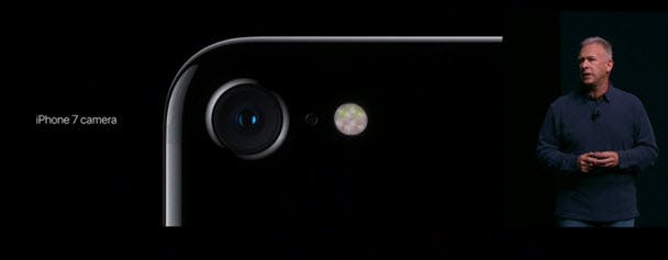 Ook de camera is eindelijk weer eens onder handen genomen, en hoe! Zowel de iPhone 7 Plus als de gewone 7 hebben nu optische beeldstabilisatie en F1.8 lens. De lens is verbeterd en het toestel bevat een nieuwe sensor die 60 procent sneller is en 40 procent energiezuiniger. De flitsers bevat nu 4 LED's en zorgt voor veel meer licht. Apple's Phil Schiller vertelde enthousiast over de verbeterde ISP (Image Signal Processor) die de beelden die je maakt met de iPhone 7 en 7 Plus veel beter zouden moeten maken. Dat laatste willen we geloven, maar is vooral ook veel marketingpraat, waarvan we de resultaten graag eerst zelf willen zien. De camera aan de voorkant heeft een upgrade gekregen van 5 megapixels naar 7 megapixels.