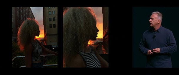 De camera in de iPhone 7 Plus is nog even iets beter dan die in z'n kleinere broertje: namelijk het zijn er twee. Dit zorgt ervoor dat je eindelijk optisch kunt zoomen op je iPhone zonder kwaliteitsverlies. Digitale zoom is nu mogelijk tot 10X, volgens Schiller met veel minder kwaliteitsverlies dan voorheen. De twee camera's in combinatie met de software van de iPhone 7 Plus, maken het mogelijk om een (gesimuleerd) scherptediepte-effect te creëren. Dit laatste effect krijg je overigens niet meteen bij je telefoon, maar wordt later toegevoegd met een update.