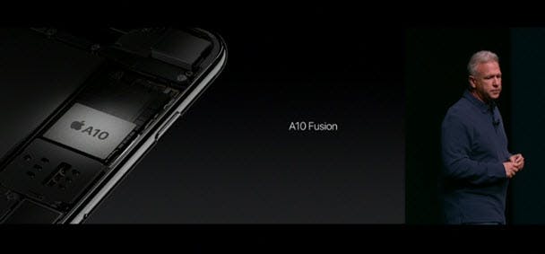 En hoe zit het dan onder de motorkap? Je snapt dat ook deze iPhone-serie weer sneller en krachtiger is. De iPhone 7 is voorzien van een A10 Fusion 4-core processor. Het toestel is daarmee 120x sneller dan de allereerste iPhone die werd uitgebracht in 2007. Naast 2 high performance cores, zijn er 2 high-efficiency cores, die zorgen voor de minder krachtige taken, zodat de batterij van je iPhone langer meegaat. Ook bevat de iPhone 7 een nieuwe grafische chip die 240x zo snel is als die in de originele iPhone. Daarnaast moet de batterij een stuk langer meegaan, al komt dat niet door een grotere batterij, maar door de verbeterde chips.
