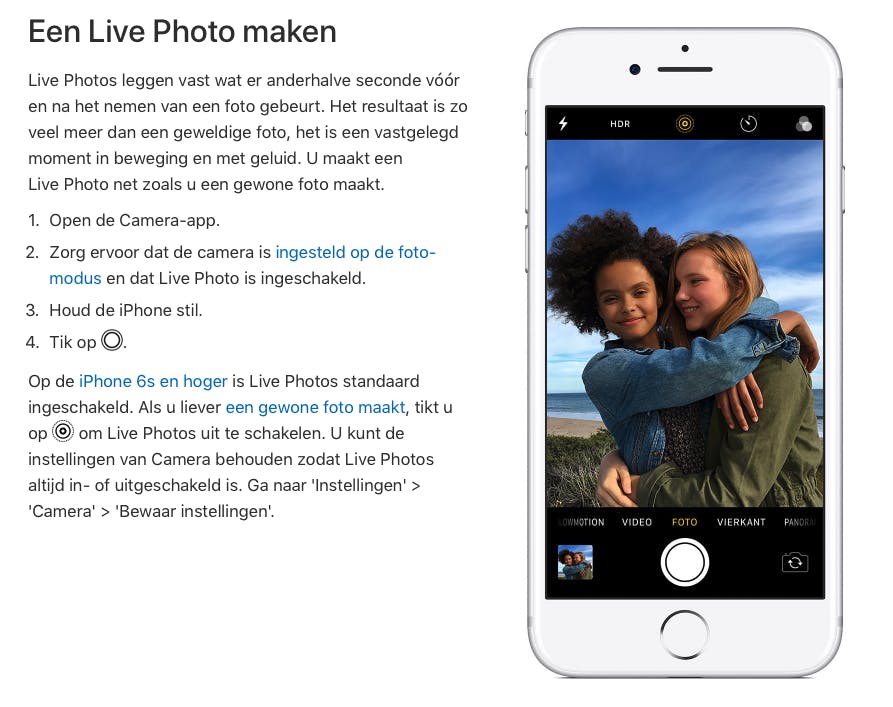 Live Photos is een functie die je op je iPhone terugvindt. Als je de optie aanzet, maakt je iPhone anderhalve seconde voor en na het maken van een foto een korte video-opname en ‘loopt’ (herhaalt) dit. Een live foto is grappig omdat je bijvoorbeeld het water van een waterval kunt zien bewegen of net even een gekke bek van je partner vast kunt leggen. Je zet de optie aan in de camera-app op je iPhone. Voor Android kun je de app Motion Stills downloaden, deze maakt ook bewegende beelden van drie seconden. Samsung heeft een functie genaamd Motion Photo. Andere apps die bewegende foto’s maken zijn Lively en Live Photo.