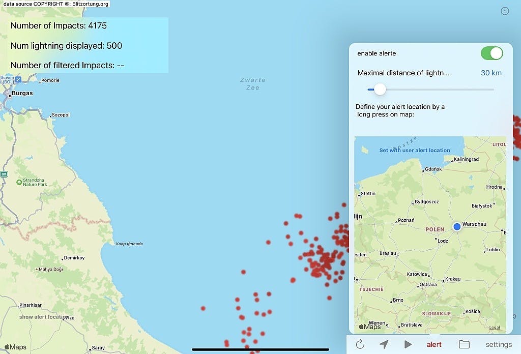 Hoe dan ook, de app werkt simpel: Start ‘m en je ziet in de vorm van rode bolletjes of er bliksems in de buurt zijn. Hoe feller rood, hoe recenter. En is het bolletje rood met een wit randje eromheen dan is het een live inslag. Praktisch is de optie alert in de balk onderaan. Hier kun je een afstand instellen waarop je gewaarschuwd wordt bij blikseminslagen. Stel je die in op bijvoorbeeld 30 kilometer en krijg je een melding, dan is het wellicht tijd om eens te kijken of er een bui jouw kant op komt. En zo ja: snel op zoek te gaan naar een schuilplaats.