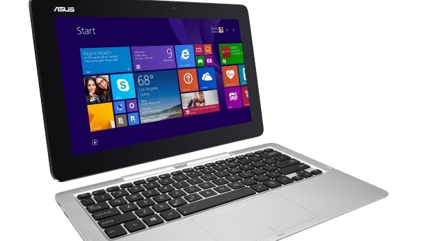 ASUS Transformer Book T200 -------------------------- **Prijs:** € 399,- **Processor**: Intel Atom Z3775 (quadcore, 1,46 GHz) **RAM**: 2 GB **Opslag**: 32 GB **Grafisch**: Intel HD Graphics **Beeldscherm**: 11,6 inch (1366 x 768) **Draadloos**: 802.11a/b/g/n **Camera**: 2 mp voor, 5 mp achter **Aansluitingen**: Usb 3.0, usb 2.0, micro-usb, 3,5mm-headsetaansluiting, 10/100-netwerkaansluiting, micro-HDMI, microSD-kaartlezer **Afmetingen**: 30,5 x 19,4 x 1,2 cm (tablet) **Gewicht**: 780 gram (tablet), 760 gram (dock) **Accu**: 38 Wh