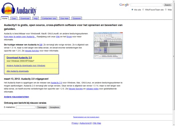 Audacity is een programma dat bedoeld is om geluidsbestanden nauwkeurig te snijden, effecten op fragmenten toe te passen en te converteren naar een ander formaat. Het programma kan met verschillende formaten goed omgaan en zit boordevol functies. Het programma is geschikt voor Windows 98 en hoger en Mac OS X 10.4 of hoger. Hebt u thuis een Linux-systeem, dan downloadt u gemakkelijk de broncode voor GNU/Linux. De meest recente versie is op het moment van publiceren schrijven 2.0.2. U kunt Audacity downloaden via de website.