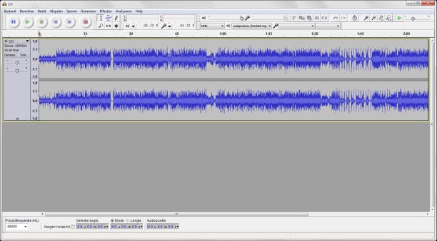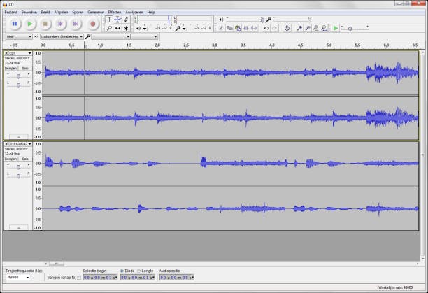Klik op Bestand / Openen en kies een geluidsbestand. Er bestaan twee soorten audioformaten: gecomprimeerde audio en ongecomprimeerde audio. Ongecomprimeerde geluidsbestanden zijn groot, maar hebben meestal een goede kwaliteit. Bekende voorbeelden zijn wav- of aif-bestanden. Het bekendste formaat is ongetwijfeld mp3. Als u een ongecomprimeerd bestand opent in Audacity, krijgt u een waarschuwing te zien. Er wordt gevraagd of u het bestand direct op uw harde schijf wilt bewerken of dat u een kopie naar het Audacity-project wilt kopiëren. De laatste optie is standaard geselecteerd en raden wij u ook aan. Zo voorkomt u dat u bewerkingen op uw geluidsbestand niet meer ongedaan kunt maken. Een gecomprimeerd bestand wordt altijd naar Audacity gekopieerd, omdat het programma niet direct met gecomprimeerde bestanden kan omgaan. Een conversie is dan altijd noodzakelijk. Als u de standaardkeuze niet bij elke actie wilt bevestigen, zet dan een vinkje bij Mij niet meer waarschuwen en altijd bovenstaande keuze toepassen. Het geluidsbestand wordt geopend en u ziet meteen een visuele weergave van de geluidsgolven. Als u een stereobestand hebt geopend, ziet u twee kanalen onder elkaar. De bovenste is altijd het linkerkanaal, de onderste het rechterkanaal. U start het afspelen door op de Play-knop te klikken of op de spatiebalk te drukken. Links van de golfvorm vindt u informatie over het bestand. De cijfers boven de golfvorm geven de tijd aan. De combinatie van het linker- en rechterkanaal heet in Audacity een spoor.