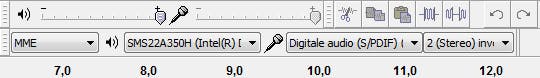 Met Audacity kunt u ook audio opnemen. Als u een microfoon hebt, is het gemakkelijk om podcasts of andere gesproken teksten op te nemen. U moet hiervoor wel eerst uw audio-interface of geluidskaart selecteren. Dit kan de interne geluidschip op uw moederbord zijn, maar als u echt professioneel aan de slag wilt, is een aparte audio-interface een goed idee. Wilt u geen audio-interface aanschaffen, dan kunt u tegenwoordig ook goed uit de voeten met usb-microfoons. Ook een computer-microfoon die u op de roze audio-ingang van uw computer aansluit, kan al voldoende zijn, al kunt u van dit soort microfoons meestal niet teveel verwachten. In de werkbalk vindt u, naast de ingangs- en uitgangsweergave, vier selectievakken. In het eerste vak kiest u de audio-host. In Windows hebt u meestal de keuze uit MME of Windows DirectSound. Welk protocol u kiest, hangt af van uw systeem. MME is het veiligst op oude systemen, maar als u een nieuw systeem hebt, kan Windows DirectSound zorgen voor minder latency (vertraging). Ernaast selecteert u uw audio-interface of interne geluidskaart. Achter het microfoon-icoontje vindt u de ingangsinstellingen. De eerste is de audio-ingang, hier selecteert u uw usb-microfoon of uw audio-interface waar de microfoon op is aangesloten. In het laatste veld kiest u voor een mono- of stereo-ingangskanaal. Een microfoon is altijd mono, dus als u alleen uw stem op wilt nemen dan gaat u voor 1 (mono) invoerkanaal. Spreek vervolgens duidelijk in uw microfoon en u zult zien dat de rechtermeter uit zal slaan. Zorg ervoor dat de meter altijd groen of lichtoranje blijft. Rood is nooit goed, dit betekent dat uw signaal overstuurt. Dit is naderhand niet meer te repareren. U kunt het ingangsvolume aanpassen door de schuif achter het microfoontje bovenin iets naar links te zetten. Hebt u een audio-interface, dan zult u dit waarschijnlijk moeten regelen in de mixer van de audio-interface, de schuif in Audacity is dan gedeactiveerd. Om op te nemen, klikt u op de opnameknop (het rode rondje). Audacity maakt automatisch een nieuw audiospoor aan.