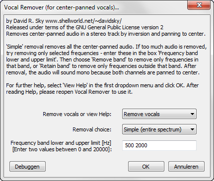 Stemmen verwijderen uit muzieknummers belooft Audacity ook te kunnen. Stelt u zich hier niet teveel van voor, want feitelijk is dit bij de meeste muziek onmogelijk. De meeste muziek is zó gemixt dat vocalen altijd precies in het midden van de luidsprekers worden gezet, in tegenstelling tot bijvoorbeeld gitaren of achtergrondgeluiden, die alleen uit de linker of rechter luidspreker kunnen komen. Het effect Vocal Remover verwijdert alle informatie uit een muziekstuk dat in het midden zit. Helaas zitten er meestal meer dingen precies in het midden, zoals de baslijn en sommige drums. Deze worden dan ook verwijderd. Effecten op de hoofdvocalen, zoals galm en echo, zijn meestal stereo en hiervan wordt ook alleen het middelste deel verwijderd. Op de linker en rechter luidspreker is dus wel de galm van de stem te horen, ook al is de directe zangstem verwijderd.