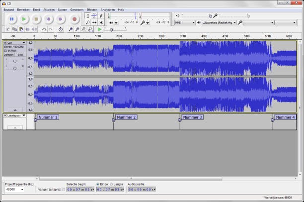 Met Audacity kunt u oude elpees of cassettes digitaliseren. Het belangrijkste hierbij is dat u de apparatuur op de juiste manier aansluit. Hiervoor moet u de uitgang van het apparaat met een kabel verbinden met de ingang van de computer. Bij de meeste computers is de ingang een roze mini-jack ingang. Dit is een kleine aansluiting van 3,5 millimeter doorsnee. Uw cassettedeck of versterker moet natuurlijk wel een uitgang hebben, een simpele cassettespeler heeft dit meestal niet. Een platenspeler moet aangesloten zijn op een versterker met phono-ingang, omdat het signaal uit een platenspeler te zwak is om te verwerken in de computer. Een uitgang is bij de meeste hi-fi-apparaten een tulpstekker, ook wel RCA-stekker genoemd. U zult dus waarschijnlijk een 'stereo tulp naar mini-jack'-kabel moeten hebben. In Audacity gebruikt u dezelfde instellingen als voor het opnemen van een microfoonsignaal, let er alleen wel op dat u bij de invoerkanalen 2 (stereo) invoerkanalen hebt geselecteerd. Speel een elpee of cassette af, pas het ingangssignaal aan en neem op door op de opnameknop te klikken. U kunt een hele elpee-kant in één keer opnemen en daarna de opname in stukken verdelen. Audacity heeft een handige functie om meteen meerdere nummers op te slaan zonder te snijden. Ga met uw cursor naar de positie waar het eerste nummer begint en klik op Sporen / Label toevoegen bij selectie of gebruik de toetscombinatie Ctrl+B. Audacity opent nu een extra labelspoor onder het audiospoor. Ga met uw cursor naar het begin van het tweede nummer en druk nog eens op Ctrl+B. Doe dit tot u alle nummers hebt gelabeld. U geeft de labels een naam door in het paarse rechthoekje te dubbelklikken en de naam van het nummer in te voeren. Klik vervolgens op Bestand / Meervoudig exporteren. In het volgende venster vult u een exportlocatie in en kiest u onder Bestanden benoemen hoe u wilt dat de bestanden gaan heten. Achter Exportformat kunt u uw favoriete formaat kiezen. Het is aan te raden een ongecomprimeerd formaat te kiezen als u de maximale geluidskwaliteit wilt behouden. Sluit af door op Exporteren te klikken.