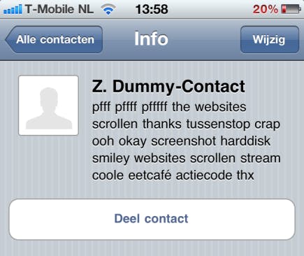 De namen in uw contactenlijst (plus alle contactvelden) worden óók door de autocorrectiefunctie herkend. Dit kunnen we dus mooi gebruiken voor een eigen woordenlijst! Maak een contactpersoon aan, en vul de velden met alle woorden die u niet automatisch gecorrigeerd wilt hebben. Eén enkel contactpersoon kan behoorlijk wat velden bevatten en in elk veld passen heel wat woorden. En mocht een contactpersoon ‘vol’ zijn, dan maakt u gewoon weer een nieuwe contactpersoon.