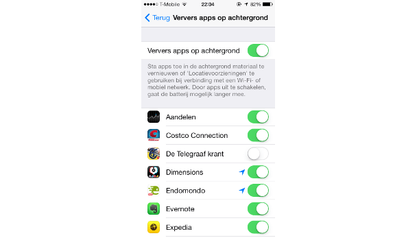 Een andere optie in iOS 7 is de mogelijkheid om apps automatisch informatie te laten downloaden op de achtergrond. Dat is handig, want zodra je bijvoorbeeld een nieuws-app start, hoeven de nieuwe artikelen niet eerst meer gedownload te worden, want dat is al op de achtergrond gedaan.