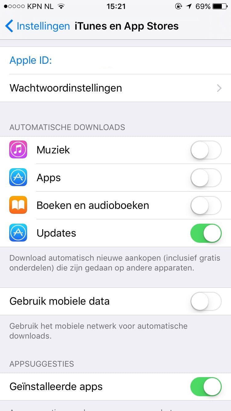 Standaard worden updates alleen over wifi gedownload, maar als je dat wilt kun je de schakelaar bij Gebruik mobiele data op groen zetten om updates ook automatisch via mobiele data te downloaden. Hier kunnen echter kosten aan verbonden zijn afhankelijk van je dataplan, en pas op dat je hiermee je datalimiet niet overschrijdt.