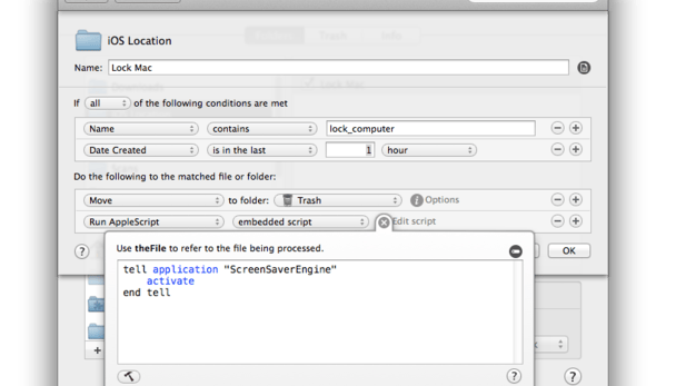 Daarna maak je een Hazel regel aan die de Dropbox map in de gaten houdt waar IFTTT deze tekstbestanden neerzet (standaard is dit /Dropbox/ifttt/ios locatie) voor bestanden die aan twee criteria voldoen: Name Contains "lock_computer" en Date Created Is In The Last 1 Hour. (De laatste voorkomt onbedoelde triggers wanneer je computer uit de slaapstand ontwaakt.) Wanneer Hazel dergelijke bestanden tegenkomt verplaatst de regel het gevonden bestand naar Trash en wordt er een AppleScript gedraaid: