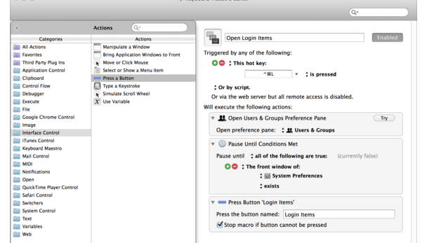 In Keyboard Maestro, kies File > New Macro en voer een naam in (zoals Open Login Items). Kies Hot Key Trigger in het menu New Trigger. Druk op een toetsencombinatie (ik gebruik Command-Control-L). Klik op New Action, en dubbelklik op Open a System Preference Pane (dit kun je vinden in de categorie Open). Kies Users & Groups in het Open Preference Pane manu (als het daar nog niet bij staat).