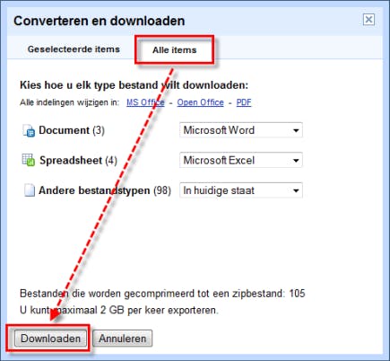 Er wordt nu een venster geopend, met het tabblad Geselecteerde items geopend. We willen niet alleen de laatste, maar alle documenten downloaden, dus klikt u op het tabblad Alle items. U kunt hier vervolgens nog aangeven of u bepaalde documenttypes niet wilt downloaden. Als u bijvoorbeeld alleen documenten en spreadsheets wilt downloaden, dan selecteert u in het uitvouwmenu achter Andere bestandstypen de optie Niet downloaden (overslaan). Wilt u een back-up maken van al uw bestanden, dan hoeft u niets te wijzigen en klikt u direct op de knop Downloaden. De grootte van al uw gezipte bestanden mag maximaal 2 GB zijn, houd hier rekening mee!