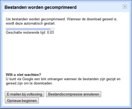 Alle geselecteerde bestanden worden nu geëxporteerd naar een zip-bestand. Dit kan even duren en is afhankelijk van hoe groot de bestanden zijn. Wilt u hier niet op wachten, dan kunt u klikken op de knop E-mailen bij voltooiing.